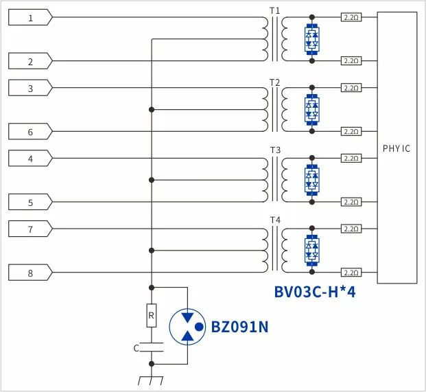 网口防护电路大致如(图1),客户初级侧共模浪涌采用90V的GDT——BZ091N,次级采用低容BV03C-H做差模防护,抑制浪涌或ESD电压尖峰。 客户反馈共模浪涌10/700us 6kV测试可以通过,端口ESD空气15KV测试设备死机需重启。通过沟通得知,板子面积较小空间受限,CPU与phy都靠近RJ45端口,布局大致如(图2)。