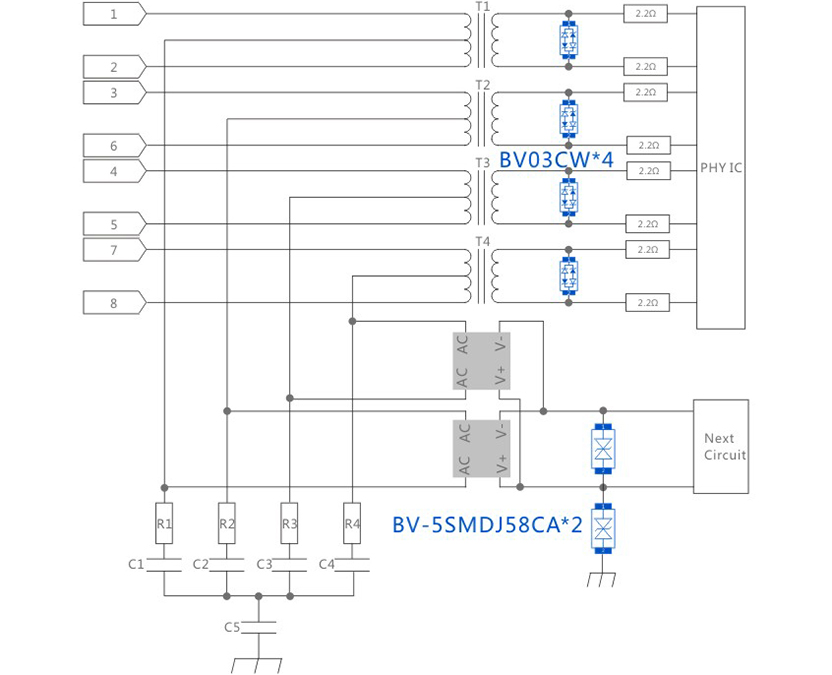RJ45POE 10/700μs CM/DM 6KV-150A