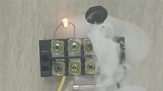 视频1:回路中加电1000V,20A时,15A的保险丝无法动作,压敏起 火燃烧。