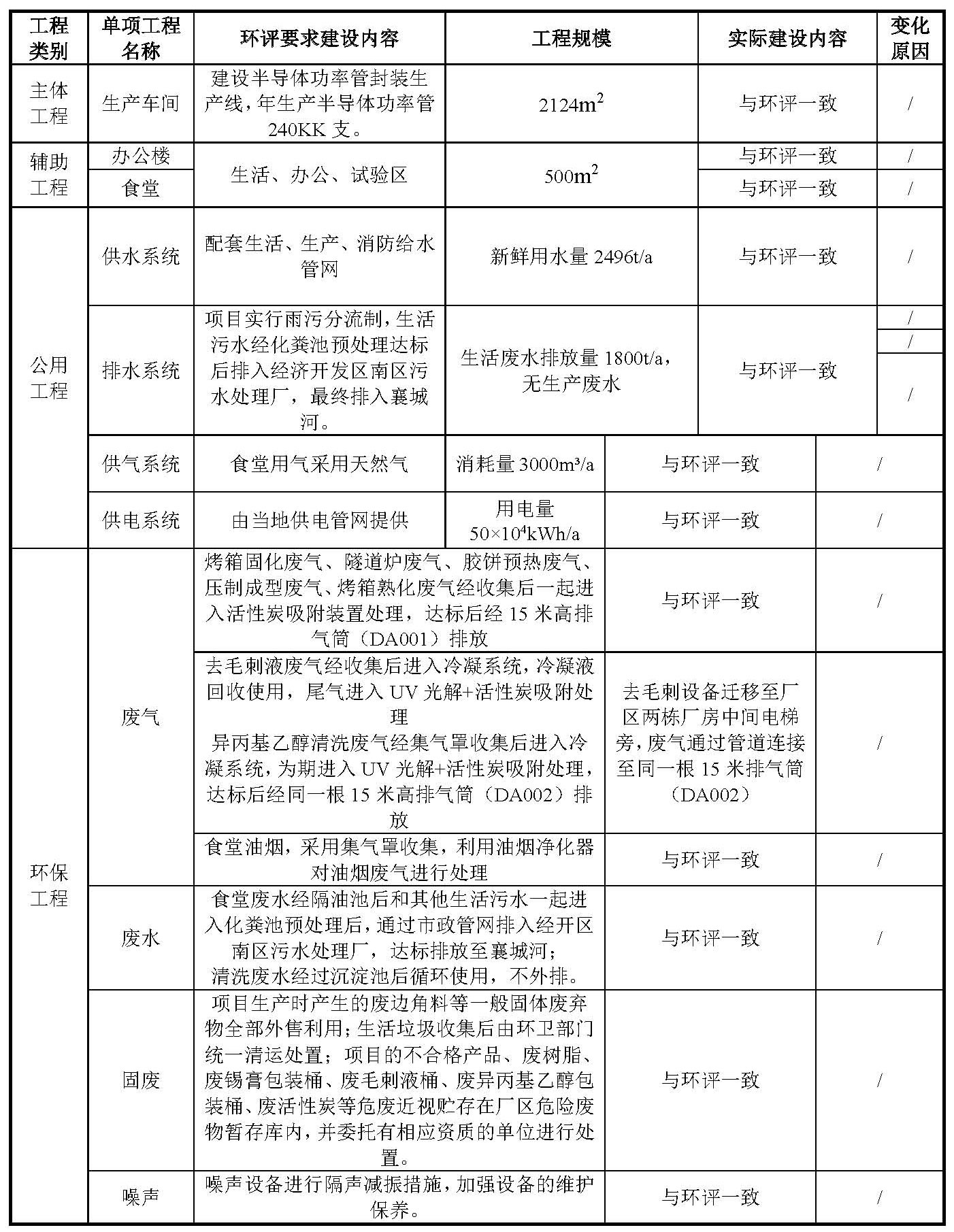 本项目营运期封装生产半导体功率管过程中,其烤箱固化废气、隧道炉废气、胶饼预热废气、压制成型废气、烤箱熟化废气,主要污染物为VOCs。厂区内设置了一套活性炭吸附装置进行处理,处理后经15米高排气筒(DA001)达标排放。去毛刺液废气、异丙基乙醇清洗废气主要污染物为VOCs,各自采用冷凝+UV光解+活性炭吸附装置处理后,处理后经一根15m排气筒(DA002)达标排放。食堂油烟先由集气罩收集,后利用油烟净化器对油烟进行处理后排放。