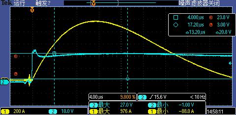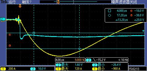 从波形看,在1KA(黄色) 时,残压为27V(蓝色),这个保护水平完全能满足市场上DCDC模块的耐压水平,也就是说,BV-SMBT-20CA能满足DC12V电源口,测试1.2/50-8/20μs@2KV-1KA的测试要求。