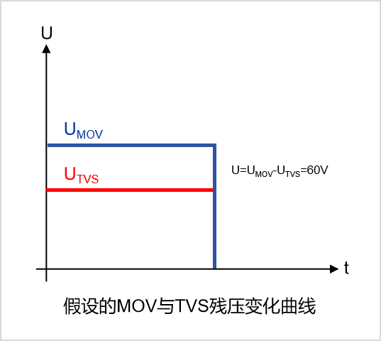 以浪涌1.2/50us-8/20μs 2Ω,6KV 3KA浪涌测试标准为例。假设MOV残压在150V,TVS残压期望控制在90V(图2),TVS的IPP 只有700A。假设,钳位电压的脉冲宽度40μs(实测),电感的电流变化40μs内应该小于700A,